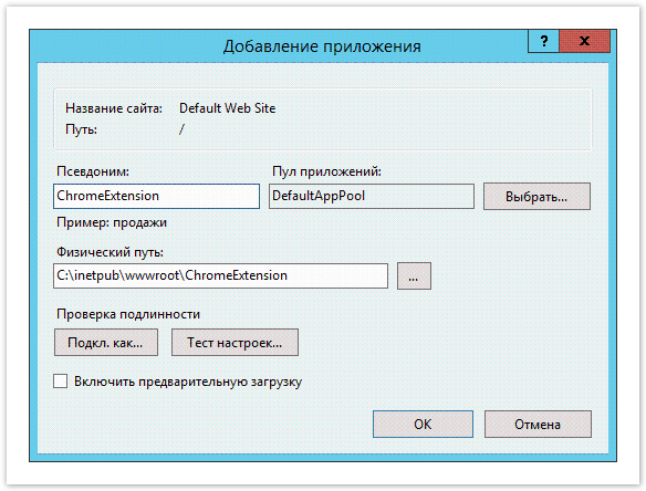 - В поле Псевдоним (Alias) введите ChromeExtension, в поле Физический путь (Physical path) введите C:\initpub\wwwroot\ChromeExtension и сохраните изменения.