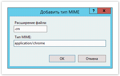 - В поле Расширение файла (File name extension) введите .crx, в поле Тип MIME (MIME Type) введите application/chrome и сохраните изменения.