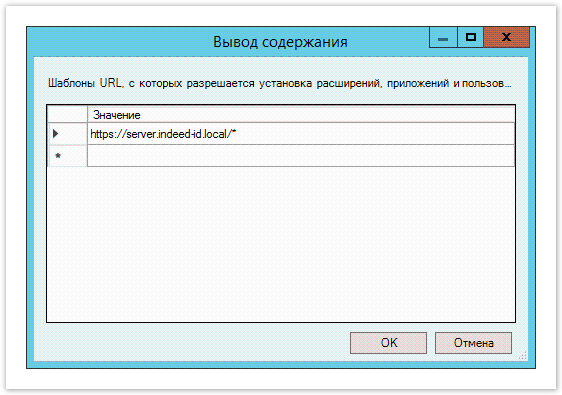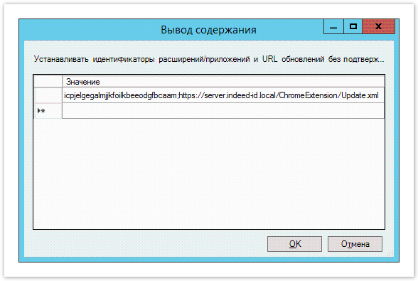 icpjelgegalmjjkfoilkbeeodgfbcaam;https://server.indeed-id.local/ChromeExtension/Update.xmlОткройте параметр Настроить источники для установки расширений, приложений и пользовательских скриптов (Configure extension, app, and user script install sources), установите переключатель на Включено (Enabled) и нажмите Показать (Show) в разделе Параметры (Options).