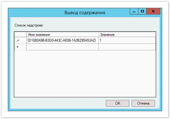 - В поле Имя значения (Value name) введите ID расширения {D1080A9B-B3D0-443C-AE86-1A2B295A53A2}, в поле Значение (Value) введите 1 и сохраните изменения.