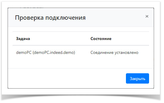 Для проверки соединения отметьте ресурс, нажмите Проверить соединение и подтвердите свои действия. Соединение будет успешно установлено в случае правильно указанного адреса ресурса и при наличии сервисной учётной записи для работы с ресурсом.