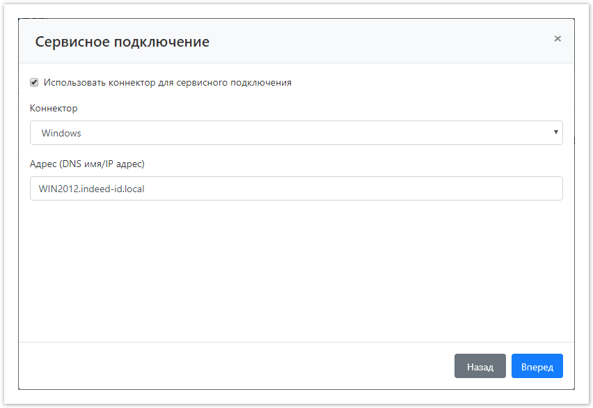 Если в качестве сервисной планируется использовать локальную учётную запись ресурса, то настройку можно пропустить и вернуться к ней после добавления учётной записи для ресурса. Если в Indeed PAM добавлен домен Active Directory, то в качестве сервисной можно использовать доменную учётную запись.