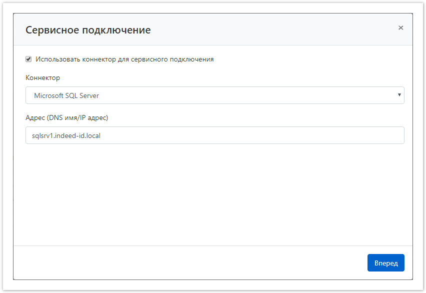 - Настройка сервисного подключения с типом СУБД Microsoft SQL Server: