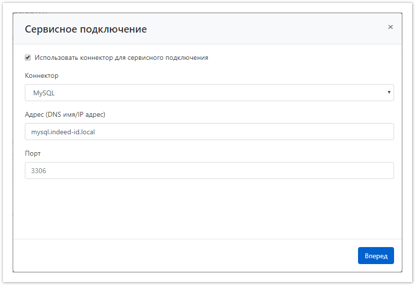 После создания сервисного подключения в свойствах сервисной учётной записи MySQL необходимо прописать имя хоста.