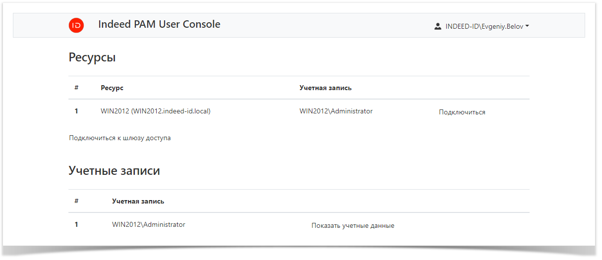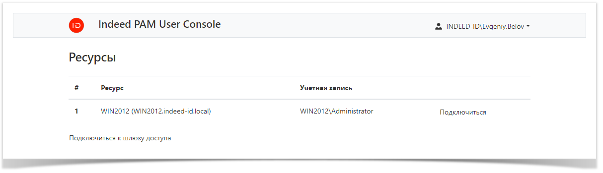 Получение доступа к ресурсам выполняется при помощи специальной оболочки для Indeed PAM Core, консоли пользователя. Доступна по следующему URL: