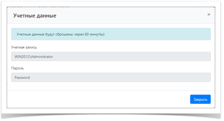 В разделе отображаются все учётные записи, для которых доступен просмотр пароля и SSH-ключа. Для просмотра нажмите Показать учётные данные, введите причину просмотра, нажмите Далее и подтвердите свои действия нажав Показать..