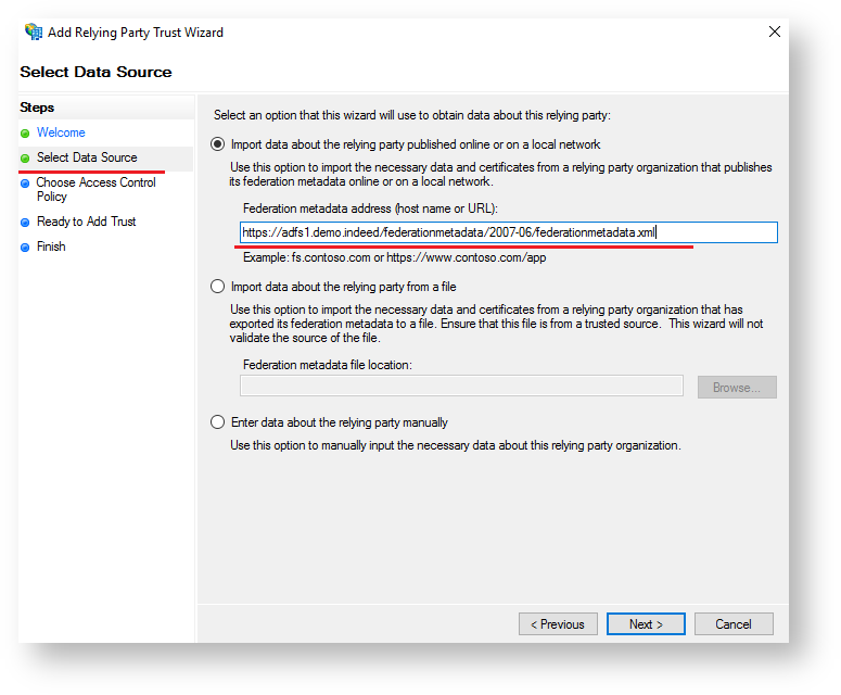 Specify the URL of your server at the “Select Data Source” tab and click “Next”.