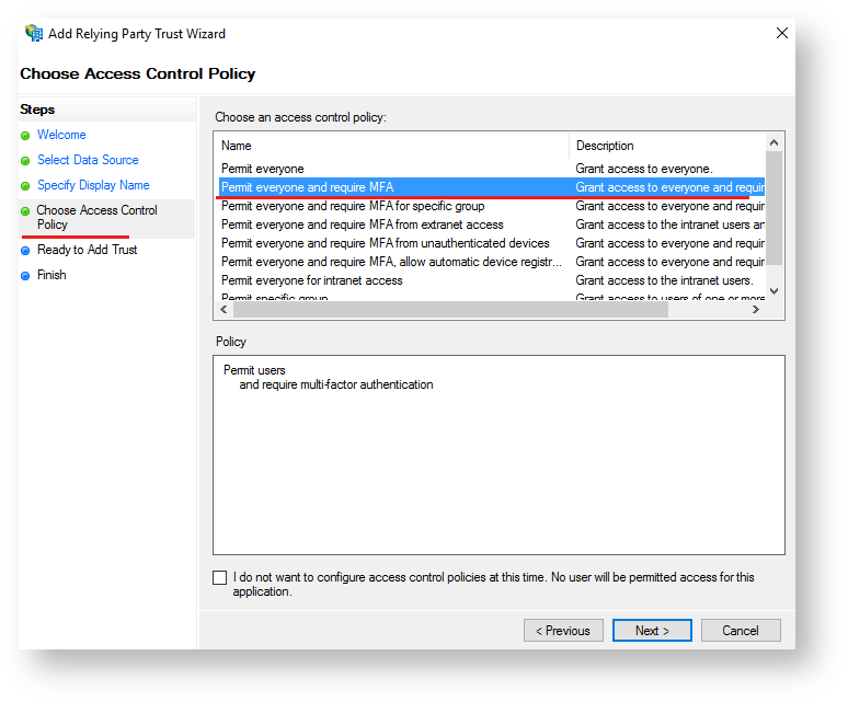 - Select corresponding policy with MFA request in the list of default ones at the “Choose Access Control Policy”. You can also add an access control policy of your choice.