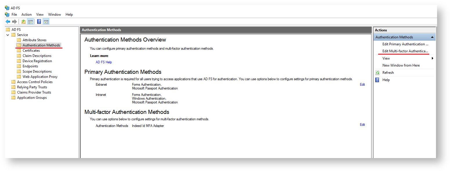 - Select “Authentication Methods”, and then select “Edit Multi-factor Authentication...” in “Actions” window.