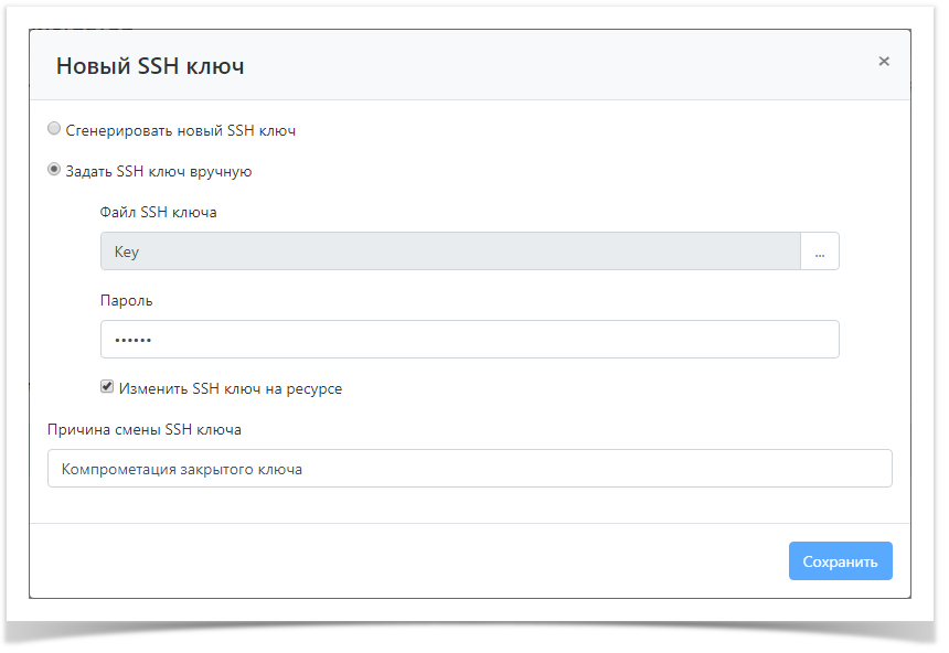 - Заполните поле Причина смены SSH ключа и нажмите Сохранить.