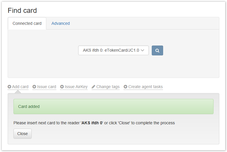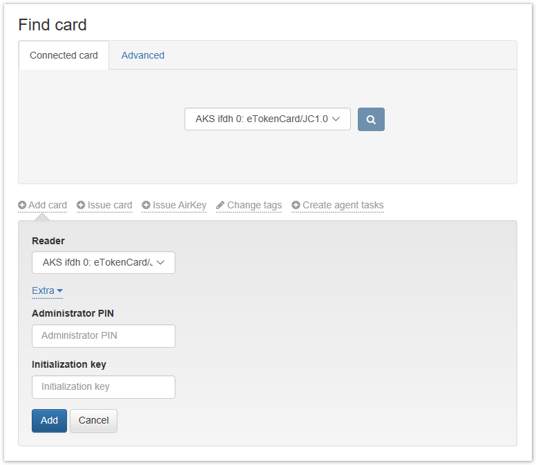 Connect the smart card to a computer, set the Administrator PIN code, if required, and click Add. After adding the smart card, click Close. Smart cards can also be added automatically by connecting them one by one to the same reader.